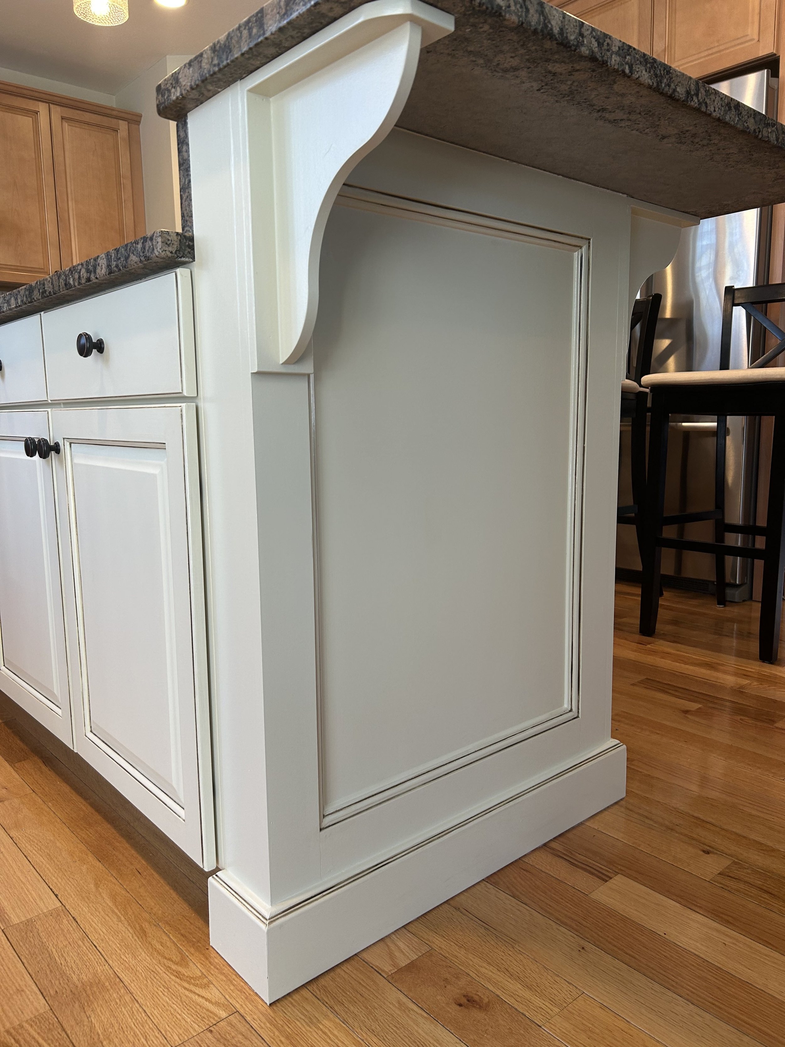 To add character and dimension, a custom-colored decorative glaze was applied, giving the island a unique, elevated look.Protective Clear Coats